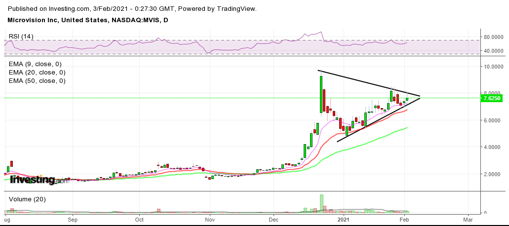 Fica aqui o gráfico da MVIS, que poderá dar um grande salto, se quebrar o triângulo.