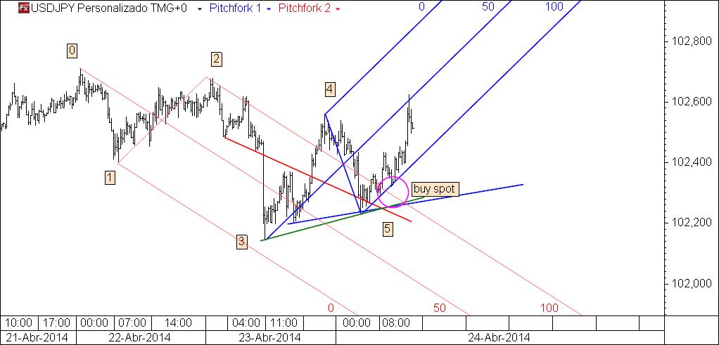 5.º gráfico:desenhando o fork ascendente e outras linhas com interesse para identificar um buy spot