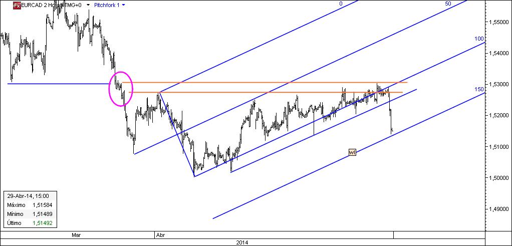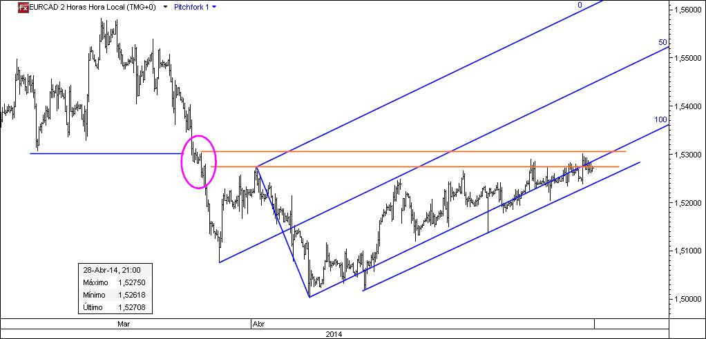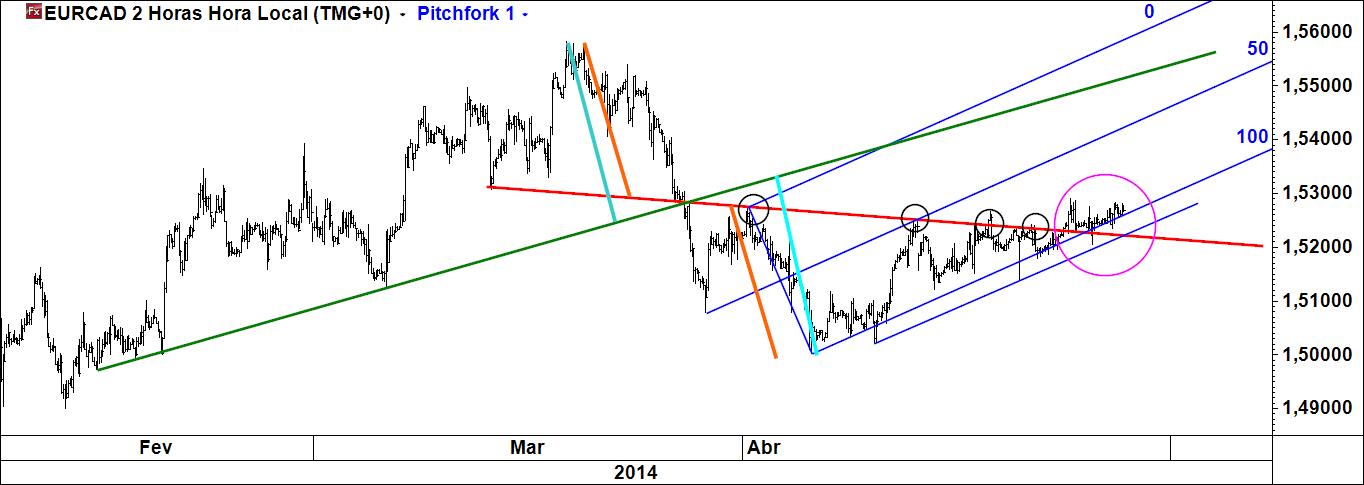 Em perseguição de uma oportunidade especulativa no eurcad 120 m, dado que o preço venceu, após várias tentativas, um nível de resistência (linha vermelha).