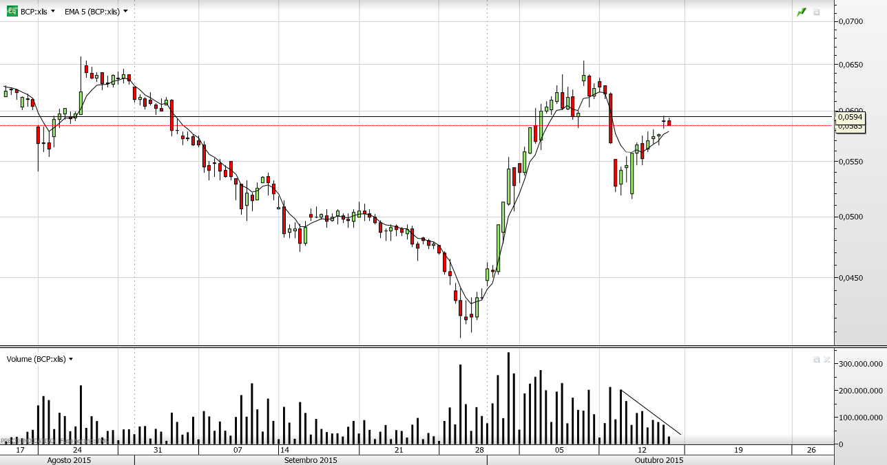 , no entanto aquele pseudo formação O.C.O.Invertido no gráfico diário deverá manter as expectativas nos investidores que o BCP possa subir mais( por mais algum tempo).Só falta esperar pela resposta do mercado.