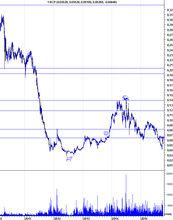 Em relação ao BCP, a acção retraiu na resistência dos 0,064 euros.. Enquanto não quebrar essa zona de resistência, os ursos continuam a dominar em todos os horizontes temporais. Recordo que os mais fantásticos ressaltos, historicamente, ocorrem em "Bear Markets".
