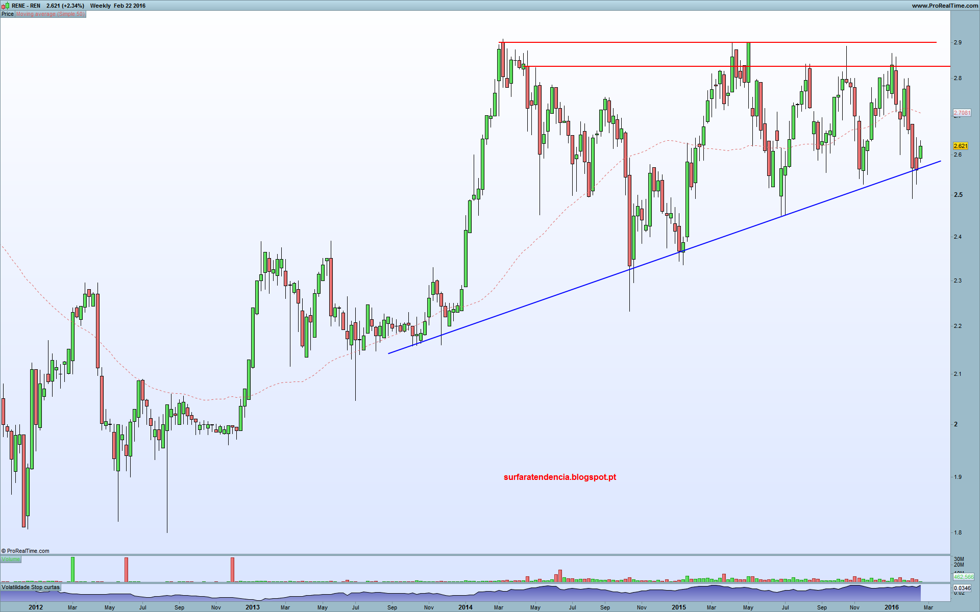 A REN continua em banho maria, enquanto oscila há dois entre uma poderosa zona de resistência e uma pouco válida linha de tendência. Esta oscilação, que lhe impede maiores ganhos, tem ainda assim permitido negociação em swings a quem a tem querido fazer. Não no gráfico diário, que é demasiado caótico, mas no semanal ou no horário. Começando pelo semanal, é nítida a lentidão de movimentos. A REN é uma empresa estável, e não se esperam para já grandes movimentações sem que a zona de resistência ou o suporte diagonal cedam. Existindo uma triangulação, é imprevisível compreender em que sentido se dará a quebra. Ainda assim, não há para já grandes evidências de fraqueza neste timeframe mais alargado.