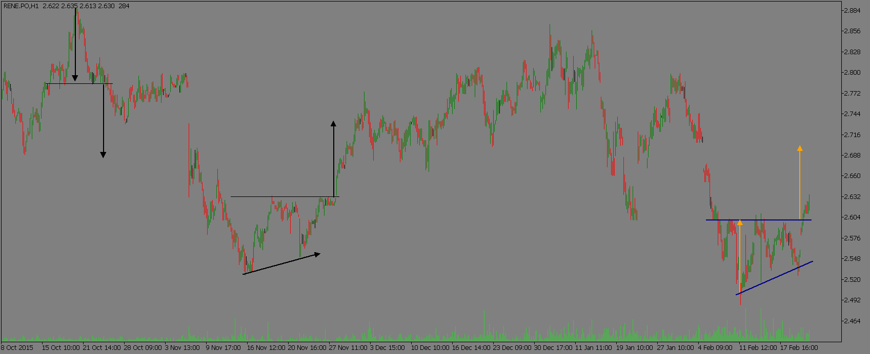 Já no gráfico horário, como disse, têm surgido com alguma frequência as oportunidades de negociação. A mais recente parece querer surgir agora mesmo, com a formação de um padrão de inversão que "ameaça" levar a cotação até à resistência dos 2,7€. É bastante semelhante ao de Novembro último, e na altura acabou por não desiludir. Para negociação de curto prazo, a maior dificuldade é para já a distância ao plano de saída. O refúgio seguro continua no higher-low, o que destrói para já o rácio risk:reward. Não será, contudo, de desprezar um pullback ao ponto de quebra. Porque aumentaria o retorno potencial, e porque muito provavelmente geraria uma nova referência de negociação.