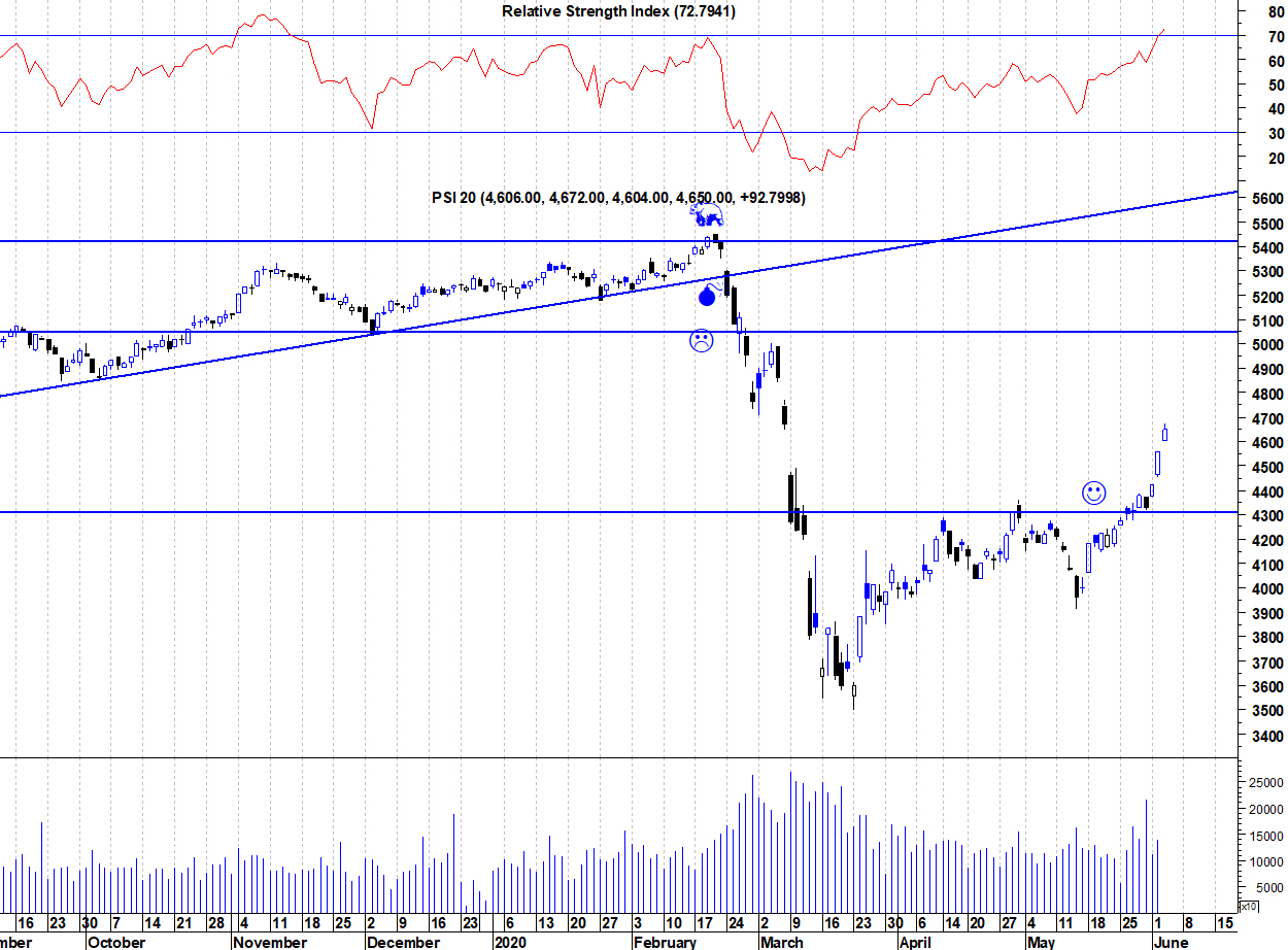 O PSI continua com dificuldades na zona da resistência dos 4300 pontos, conforme é visível no gráfico actualizado.