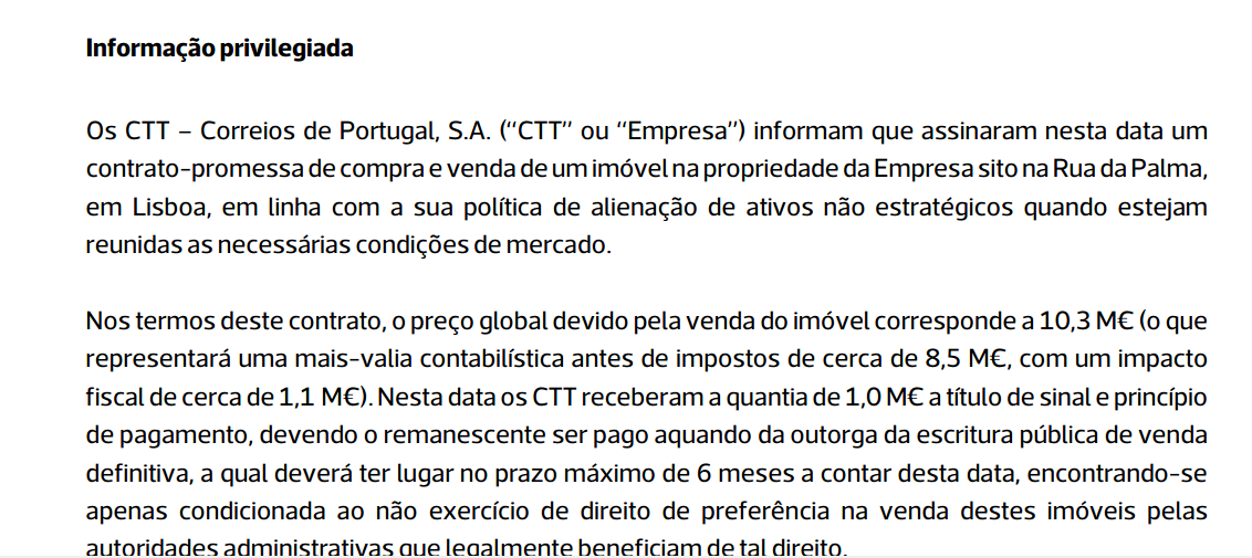 Eagle acho que no caso dos CTT tens razao em muita coisa. So nao concordo que vender imóveis nao estratégicos seja vender os anéis. ISto nao é uma empresa de real estate, se os prédios não têm utilidade, para quê mantê-los?