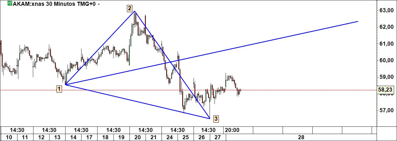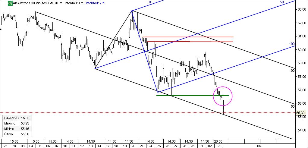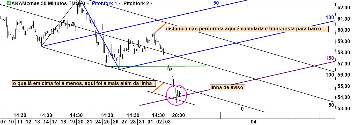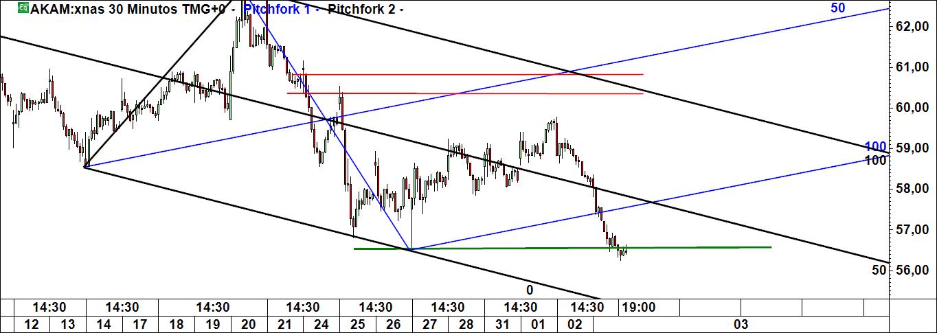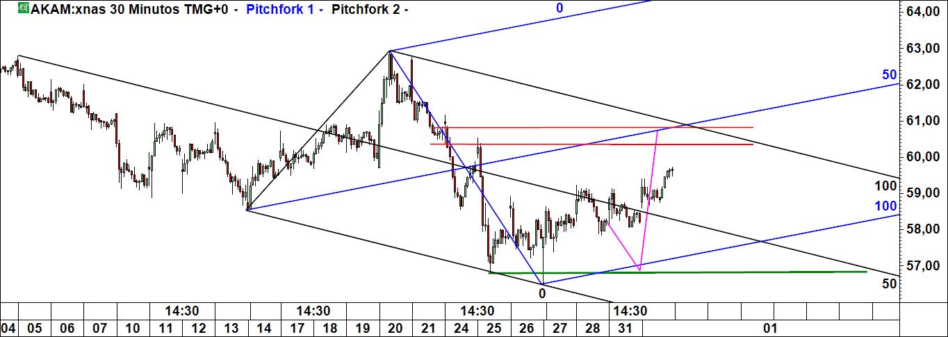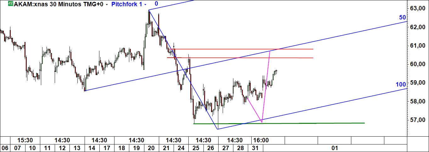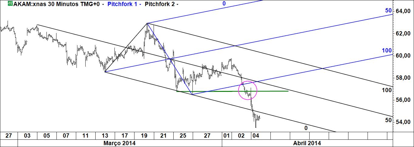 Assim à primeira vista, apesar da linha média de Pitchfork apontar num sentido ascendente, creio que o nº de barras do gráfico apresentado é suficientemente elevado para indicar que a tendência dominante no gráfico de meia hora da Akamai Technologies é, contrariamente ao que diz o canal de Pitchfork, essencialmente descendente, pelo que o risco de não se vir a materializar o cenário que indicas é substancial.