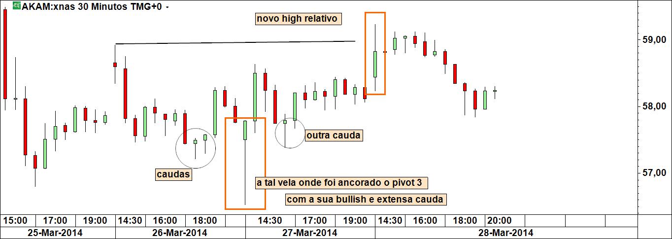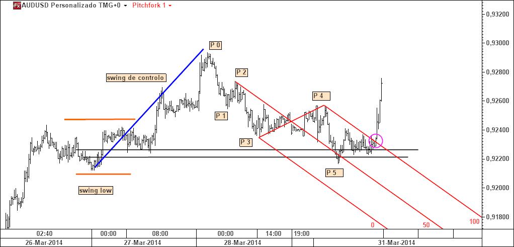 4.º o pivot 3 do fork está ancorado numa barra que mostra forte pressão compradora nessa zona, o que me dá segurança para colocar a stoploss abaixo dela: repare-se que formou uma cauda bem assinalável, tendo fechado no seu terço superior, ou seja, apesar de nesse momento ter feito um novo mínimo para o movimento, apareceu suficiente força compradora que "devorou" a oferta aí disponível