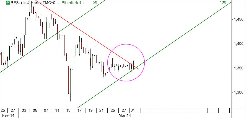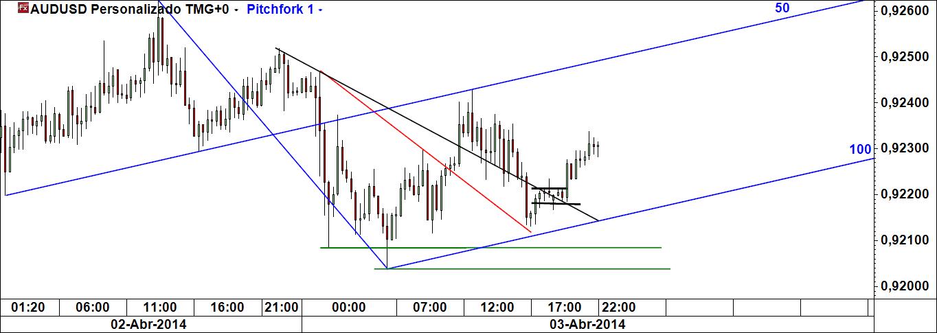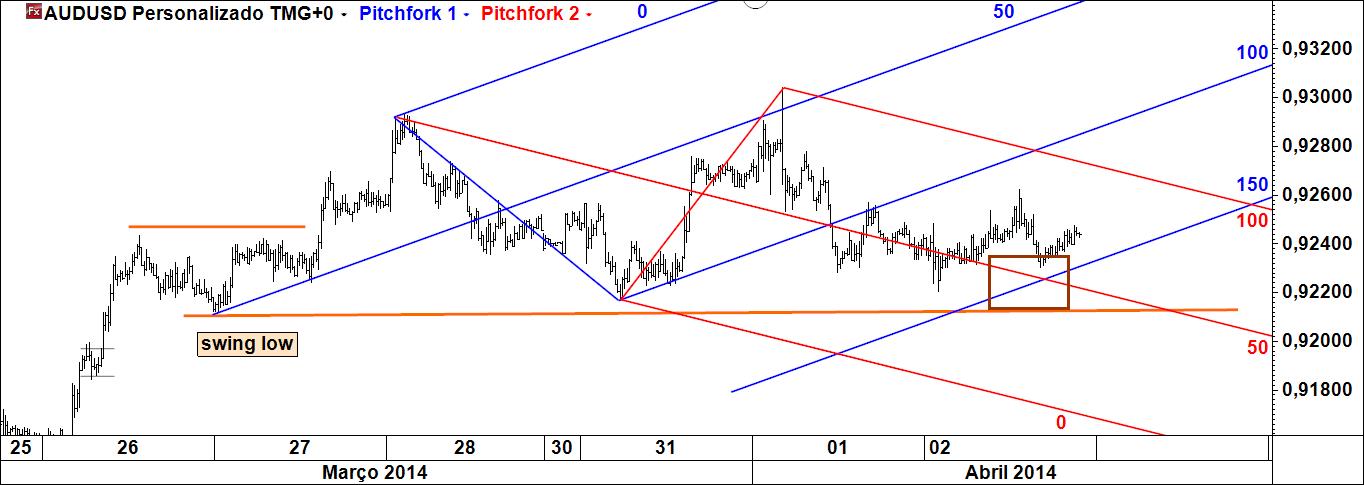- na ânsia de encontrar um lugar para uma compra, preocupei-me com o tipo de velas que o preço fez em determinada área e não tive em devida atenção algo que parece ser um pouco subtil mas que mais não é do que o devir do preço: quando identifiquei a oportunidade especulativa, a compra seria realizada numa zona de confluência entre a linha inferior do fork azul e uma linha que unia dois mínimos e que poderia constituir um suporte (ver gráfico do dia 2/4); dado que o tempo foi decorrendo sem que essa área tivesse sido atingida – na verdade, o preço não só não desceu, como ainda subiu um pouco – a queda do preço que então se desse implicaria necessariamente a violação da linha média inferior do fork azul (pois só caindo abaixo dela é que a ordem de compra pendente podia ser executada)