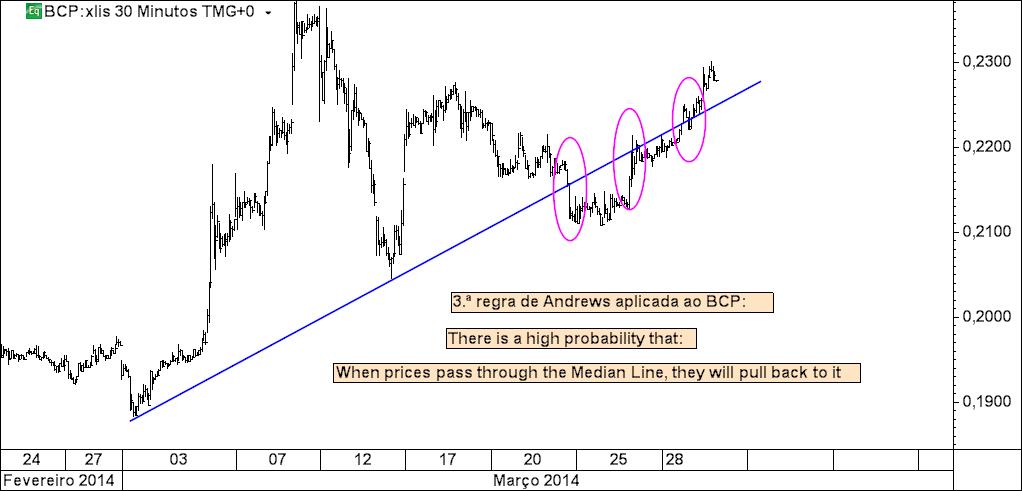 a este movimento de reversão a meio do caminho dá-se o nome de Hagopian´s rule (Hagopian era o nome do aluno de Andrews que estudou este fenómeno) e que aparece descrita como regra n.º 4 de Andrews: When prices reverse before reaching the Median Line, leaving a “space”, they will move more in the opposite direction than when prices were rising toward the Median Line. Por outras palavras: quando o preço é suposto dirigir-se a uma linha (qualquer delas), mas a certa altura do percurso desiste e inverte, ele não só irá dirigir-se para a linha contrária àquela a que se dirigia, como ainda prosseguirá além dela pelo menos numa distância equivalente àquela que deixou de percorrer – ver último gráfico