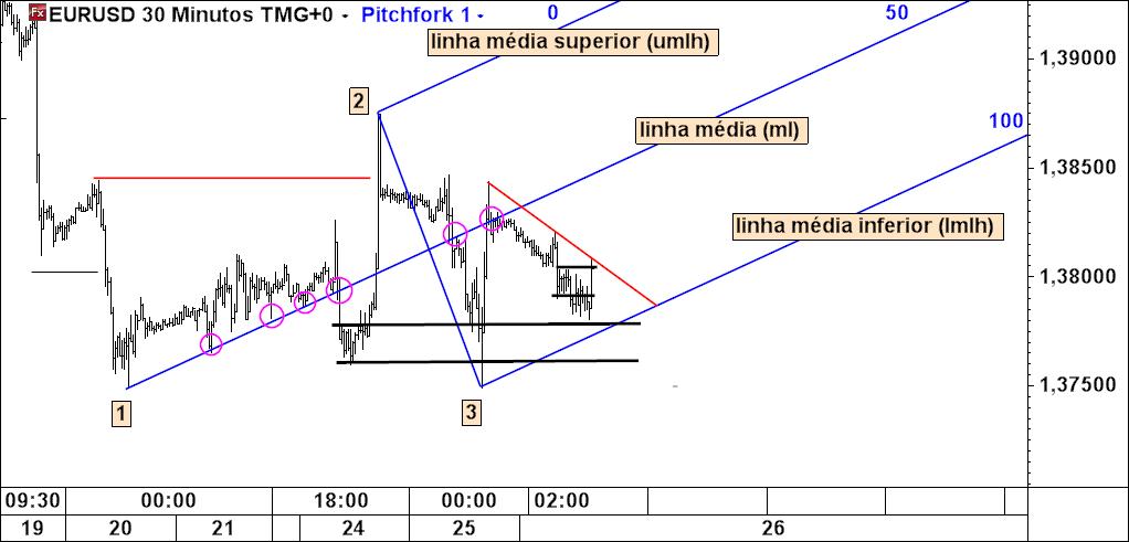 Deixa-me tentar trocar por miudos em linguagem de compras e vendas, no último exemplo que citaste do EURUSD de 30 min creio não estar enganado que se espera que os preços quebrem a LTD vermelha para gerar uma ordem de compra (digo compra porque a pendente da trend é ascendente, dada pelo sentido do canal linhas de Pitchfork) próxima dos 1,3800, uma vez que há 80% de chances das futuras cotações retornarem à Linha Média, nessa altura perto dos 1,3850 para ter como objetivo fazer aí uma venda e fechar a posição, é isso?