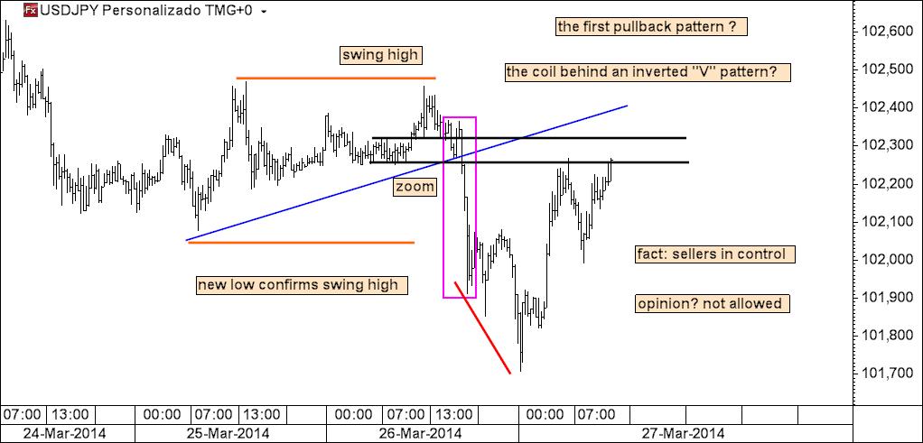 eurusd: embora não se tenha identificado a stoploss, para todos os efeitos é um trade perdedor pois ela seria colocada abaixo do último mínimo e este foi quebrado
