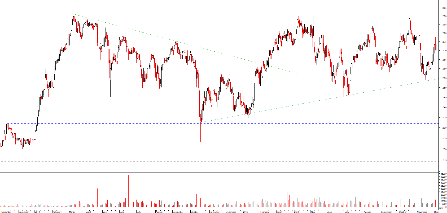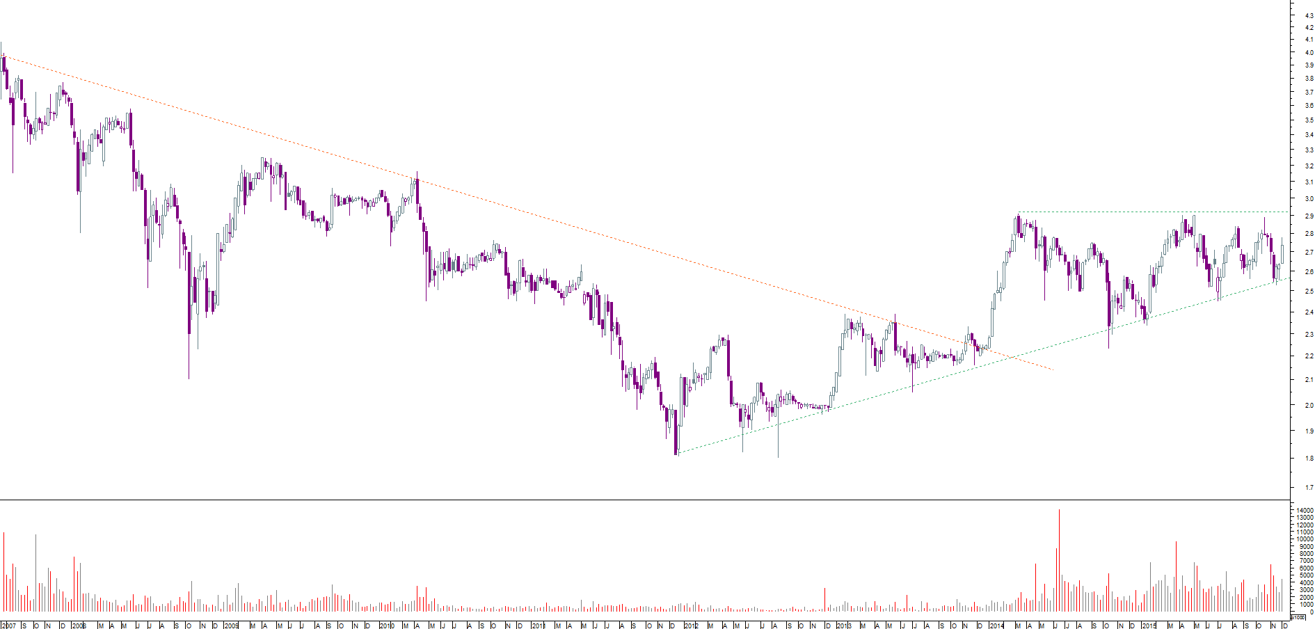 Tem vindo a fazer uma lateralização/pseudo triangulo ascendente nos dois últimos anos. Uma ruptura em alta, quebra acima da zona dos 2.80/2.90 (por aí....) podia ser interessante.
