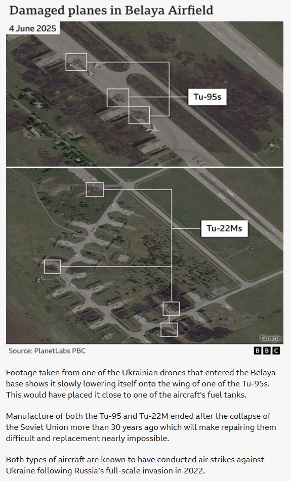 Há imagens de satélite que mostram, 8 Tu-95M, 12 Tu-22M3, 2 A-50 e 1 An-12 atingidos.