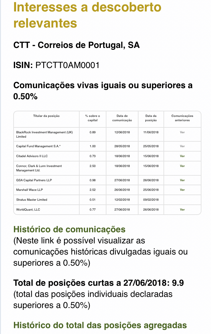 Posições curtas CTT mantem-se nos 9.90% ( Posição elevada e sem grandes alterações face aos máximos nos 10% )