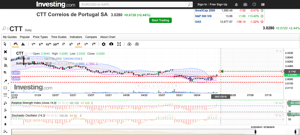 CTT com pormenor técnico perfeito , após recuperação dos 2.70 aos 3 euros vai testar a LTD de curto prazo , fazendo o terceiro toque não conseguindo ultrapassar e tendo hoje o primeiro dia de recuo após ir testar a LTD , fechando abaixo dos 3 euros .