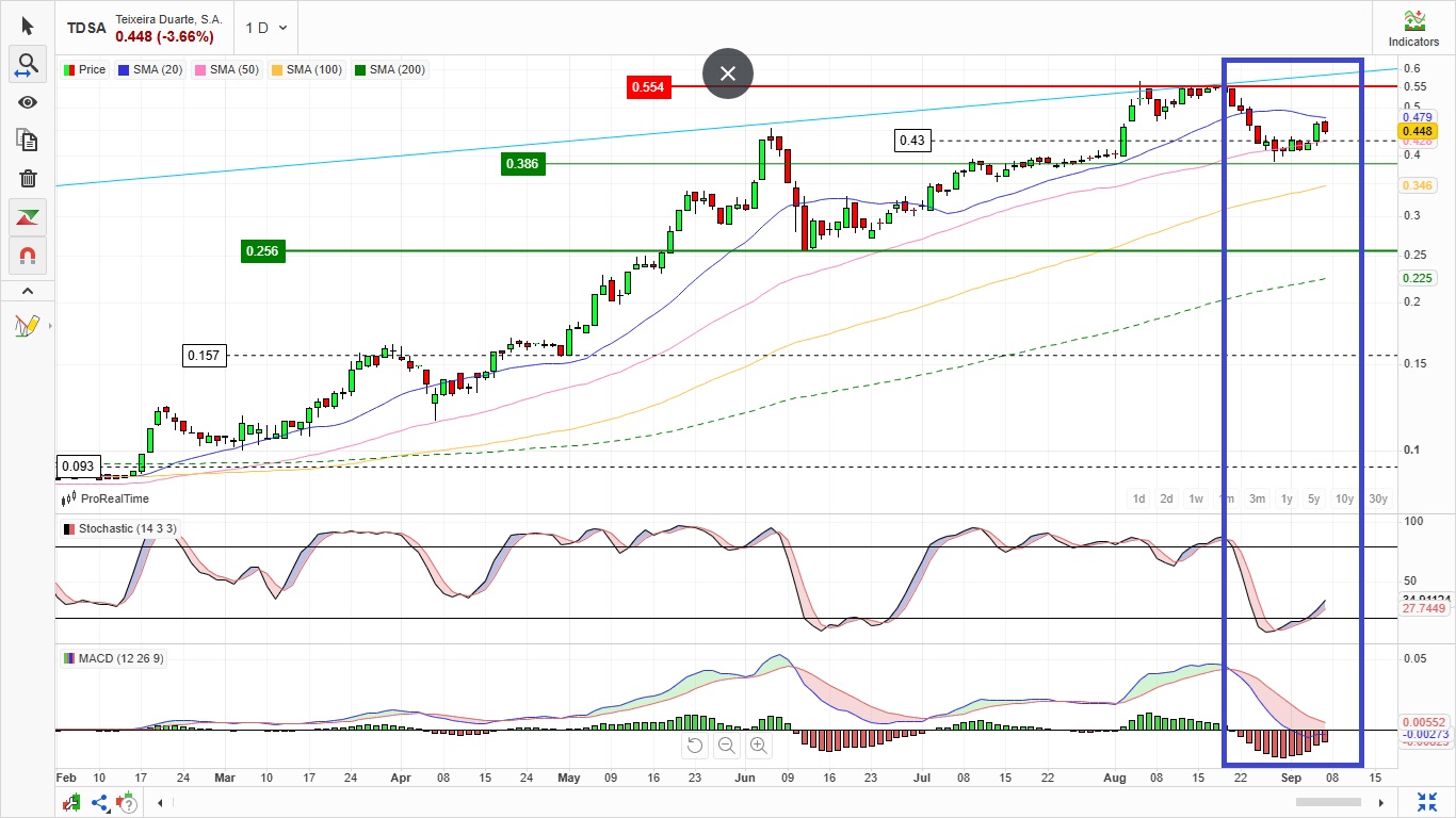 Para uma analise superficial ao atual momento da Teixeira Duarte deixo aqui um gráfico onde podemos verificar que ontem a ação tocou praticamente na Média Móvel Simples de 20 períodos (SMA 20) vamos ver nos proximos dias se passamos a estar a negociar acima desta.