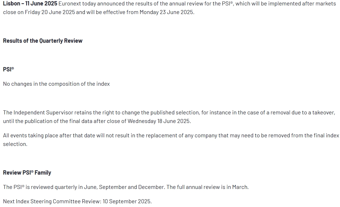 Esta edição é posterior ao próximo post , quem gere o mercado é a Euronext , podem verificar no site da Euronext que praticamente todos os indices geridos pela Euronext são revistos nos próximos dias , a informação é clara e óbvia , após as reuniões á um certo delay até á divulgação , agora procurar justificar e insistir seria mais fácil confirmar na fonte, anexo alguns link´s de outros indices geridos pela Euronext onde as datas são todas esta semana, há mais mas julgo que estes serão representativos