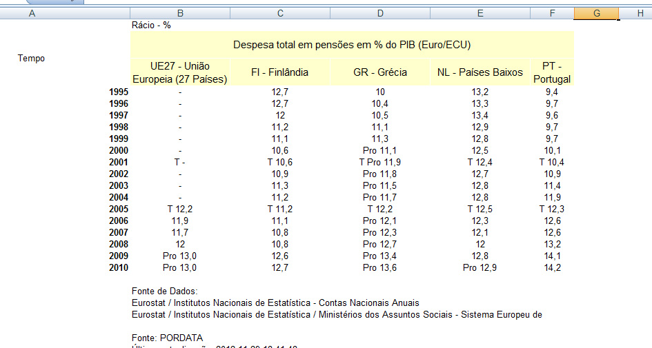 quanto ao peso das pensões em % do PIB encontrei na pordata, escolhi a UE27 e alguns paises que tem +- a mesma população que portugal: