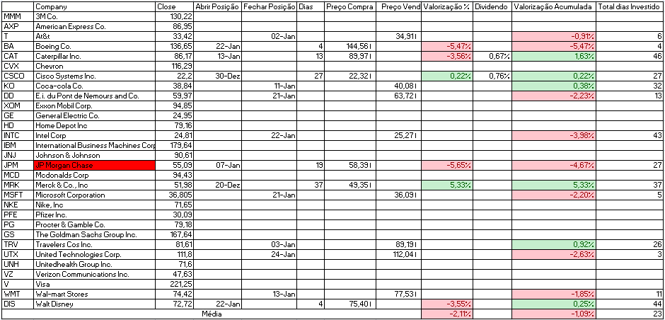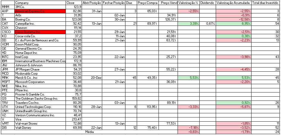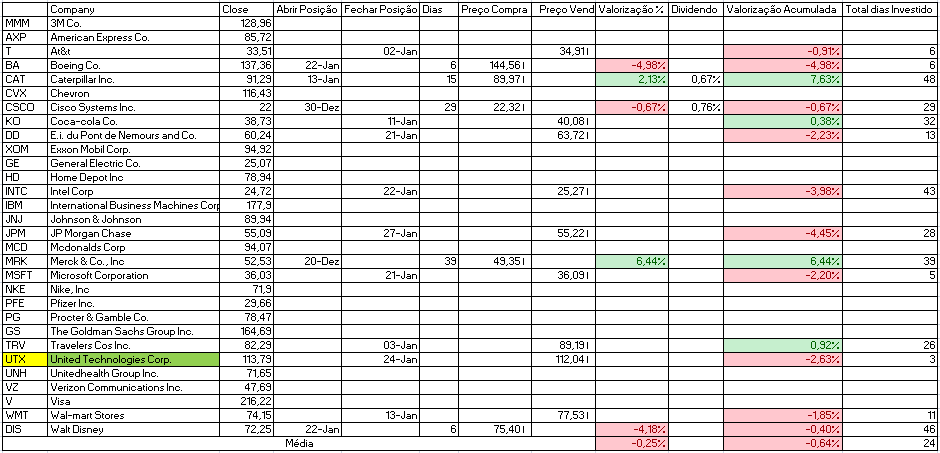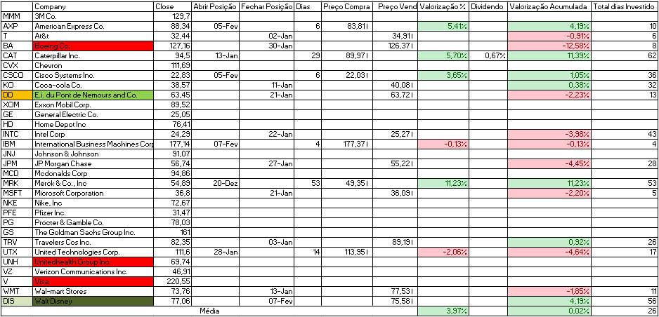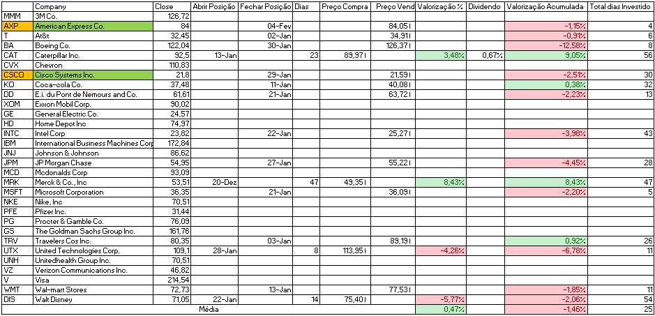- Venda: American Express Co. e Boeing Co., que neste momento apresenta uma desvalorização de mais de 10%