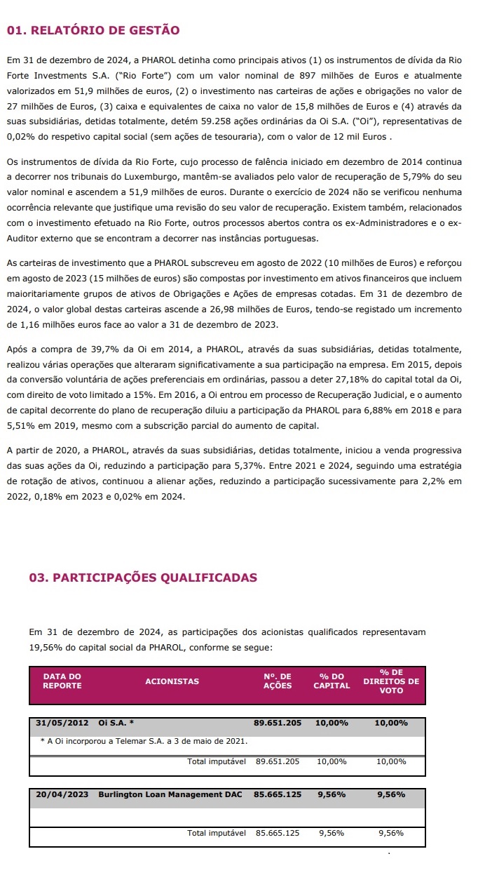Penso que a PHAROL já não tem ações da Oi, mas a Oi ainda detém 10% da PHAROL, sendo a sua maior accionista...