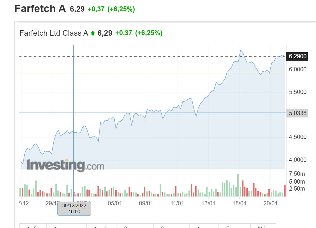 A Farfetch teve um ano de 2022 para esquecer. Mas parece que esses tempos negros já ficaram para trás. E desde o fim do ano de 2022 até hoje subiu uns espantosos 65%.