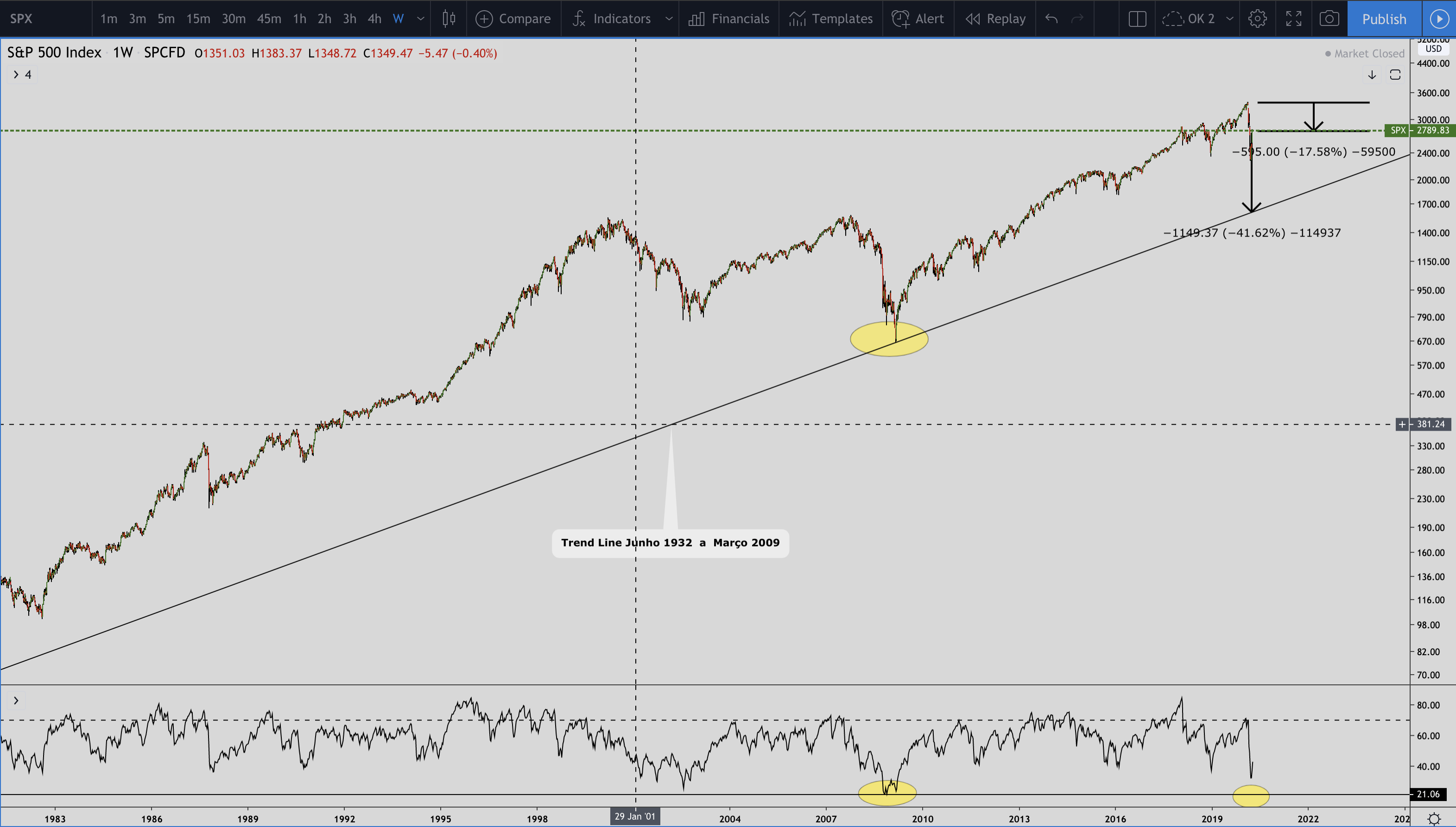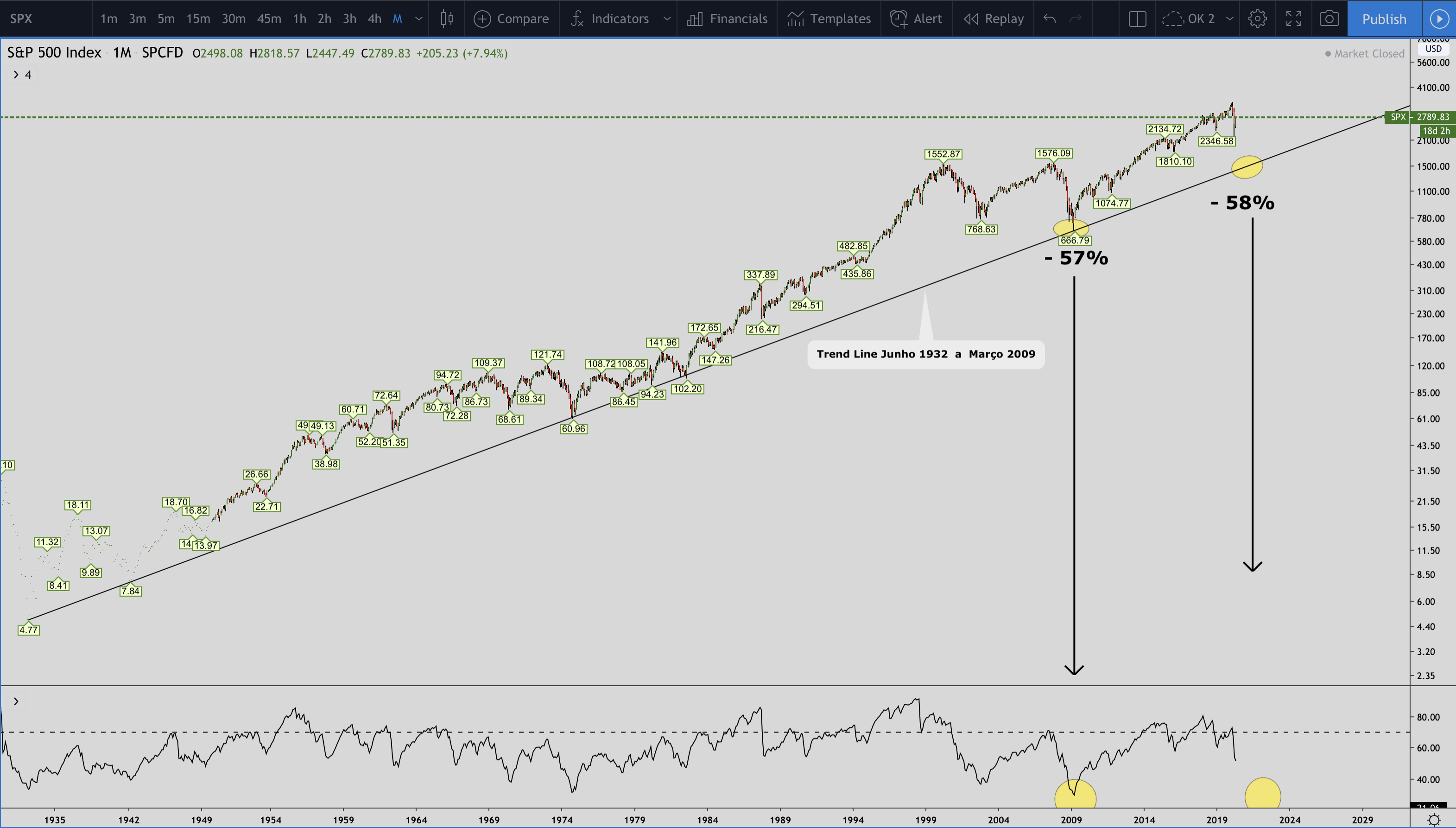 Fiando no RSI, e suporte na Treand Line de 1932 a 2009, perdas de 58% são ainda possíveis.