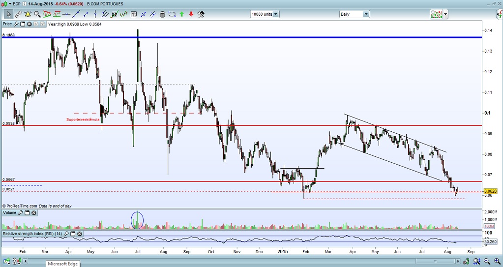Estando convicto que o PSI 18 irá testar, novamente, o seu forte suporte nos 5200-5300 pontos e não tendo o BCP, presentemente, suporte, digno do nome, é natural pensar que o BCP irá fazer, proximamente, novos mínimos.