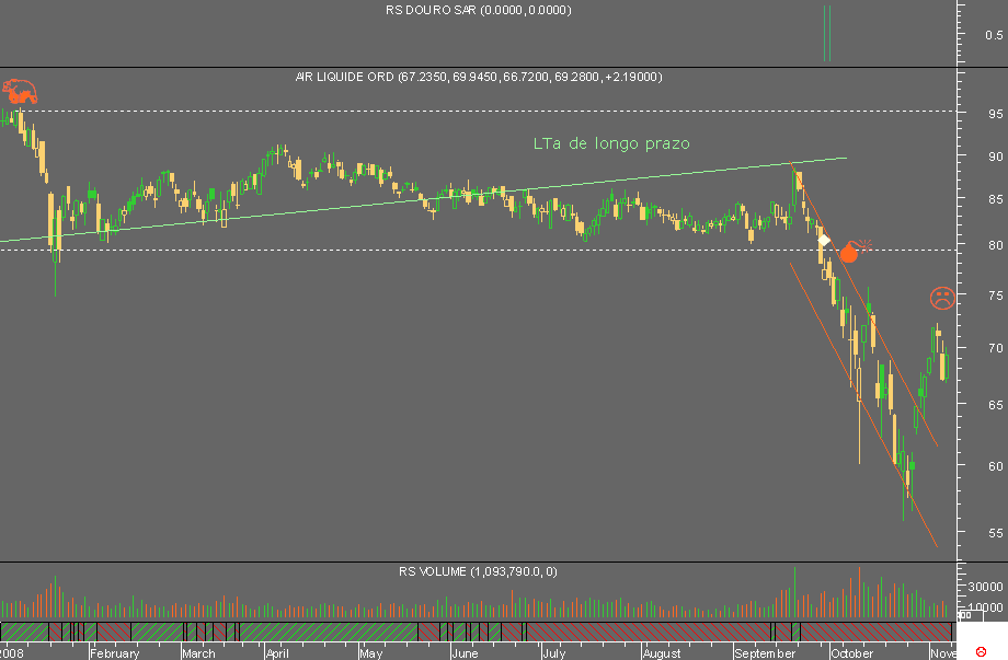 uma análise à Air Liquide: após o máximo de inícios de janeiro instalou-se o urso: lateralizou durante nove meses, fazendo lower highs; a partir do momento que quebrou os mínimos de fins de janeiro fez um lower low, confirmando a tendência primária de bear market