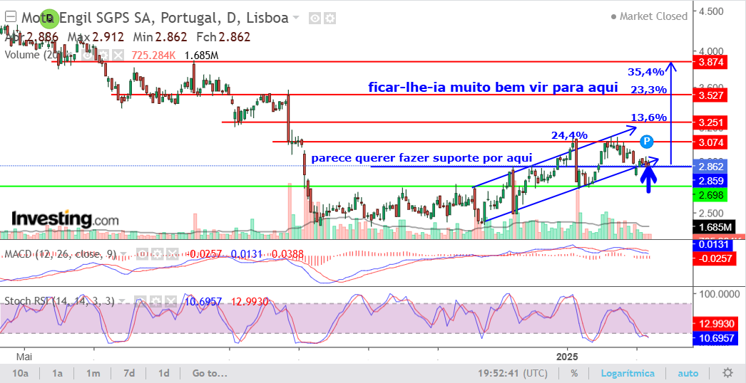 Provavelmente diria que foi uma aposta (furada) que as tarifas do Trump iriam continuar a deitar abaixo as ações europeias, bem como as construtoras, mas parece que lhes saiu o tiro pela culatra (que pena que tenho deles) e os mercados reagiram hoje em alta e a Mota não foi exceção, liderando o Top 10 das recuperações das construtoras europeias, subindo 2,11% com um baixo volume (metade do volume médio dos últimos 180 dias), quando isto acontece, regra geral significa que os bears estão a perder a força e que o sentimento global tende a dar mais probabilidade à subida do que à descida da cotação.
