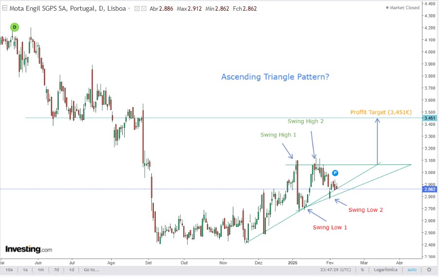 Já temos os dois clássicos swing highs e swing lows, pelo que, a ser testada novamente a resistência dos 3.07€, se o fecho for acima deste valor, teremos um breakout pelo upside e a projeção clássica é a de uma subida, desde o ponto do breakout, equivalente à distância da base, que objetivamente se encontra nos 3,451€ (e curiosamente serviu de suporte entre junho e julho do ano passado.