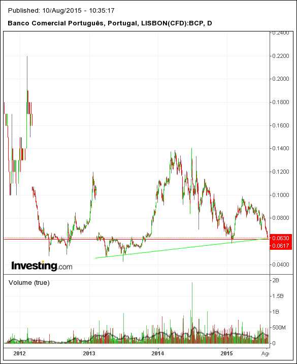 Está na altura de reagir, uma quebra dos suportes em torno dos 6 cêntimos deixarão o título numa situação técnica bastante vulnerável, embora ainda haja muitos outros suportes "por ai abaixo" até, mais ou menos, aos 3 cêntimos, onde atingirá mínimos históricos... espero que isso não venha a acontecer, e que o BCP inverta a tendência perto dos 6 cêntimos!