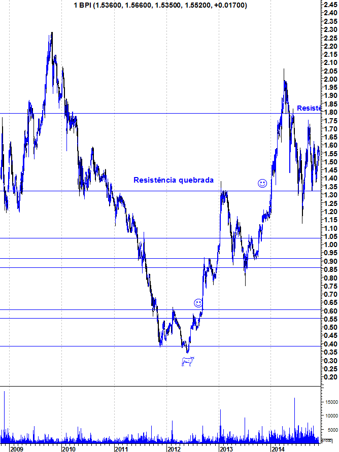 Se quebrar os 1,40 com confiança já só imagino o Bpi aqui ~1,28, duvido que quebre esta linha de tendência ascendente e faça um novo mínimo relativo abaixo de 1,1. Mas nunca se sabe... Agoa que era um bom ponto de entrada com stop lá isso não haja dúvida