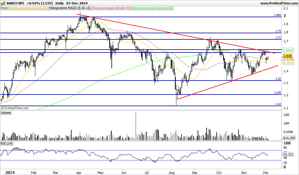 Até acho que pode fazer um máximo relativo quebrar a linha de tendência e a M200 mas os problemas por resolver no novo banco vão limitar bastante a evolução do BPI no curto prazo. O cenário de máximo relativo e respectiva retracção parece-me o mais provável.