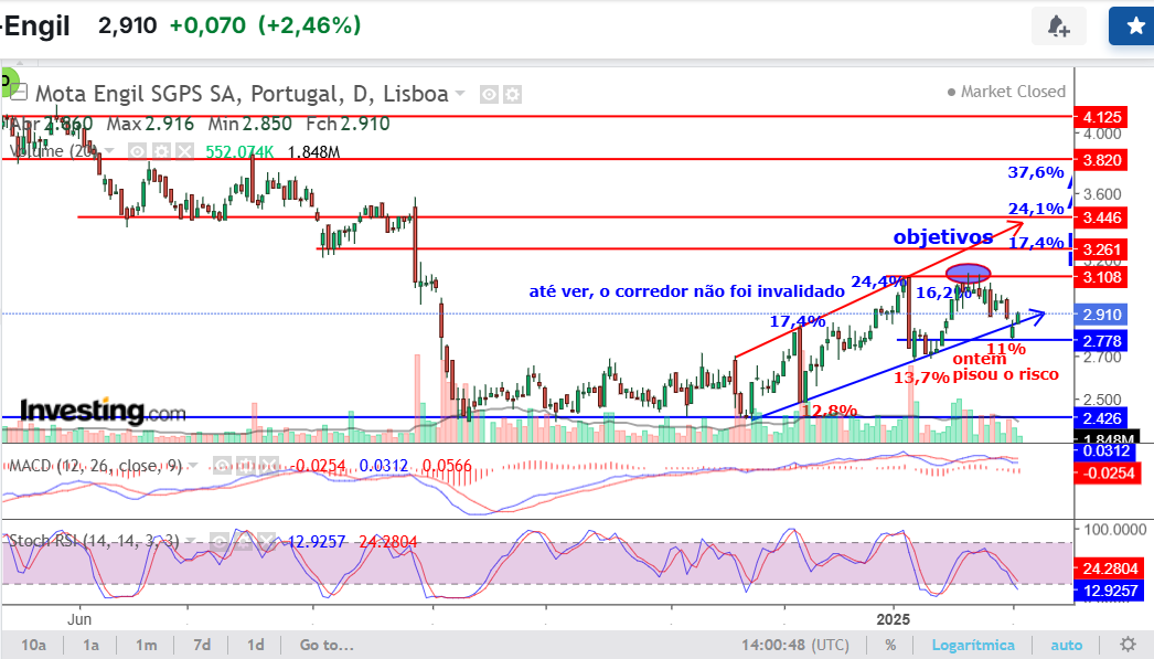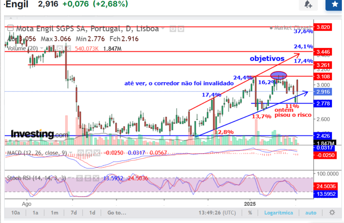 Ontem pisou o risco de facto, mas o RSI agradeceu estes últimos dias, em sobrevenda mas a Mota quase nos 3 euros outra vez, portanto boa margem para seguir para os alvos apontados.