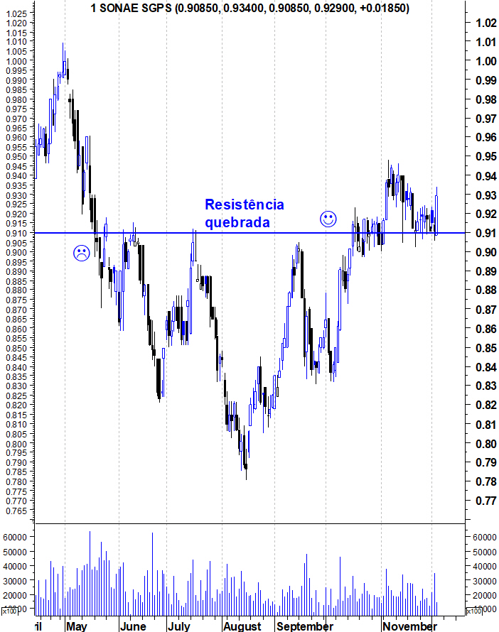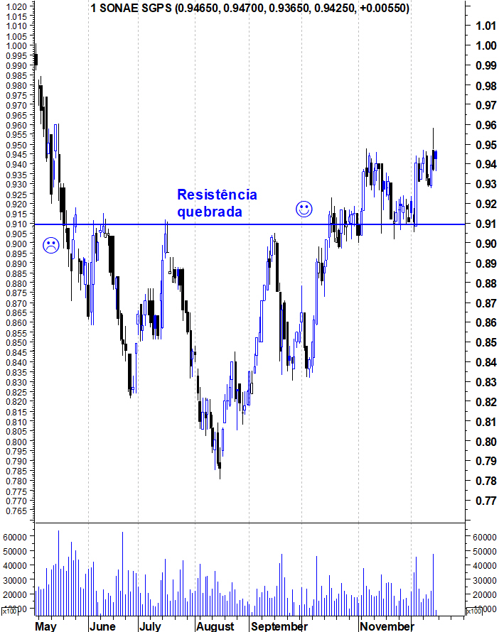 Então para que é que a AT serve? Na minha forma de ver serve para identificar a informação que cada um considera importante para definir a sua estratégia. Pegando neste exemplo da Sonae, e na minha forma de me posicionar, se vier a entrar (e já há algum tempo que ando tentado) será nesta zona e não mais acima. Se entra mais acima, uma vinda a esta zona será normal e eu terei de colocar um stop mais abaixo, por isso terei de correr um risco maior. O stop lógico,para mim, deve estar na zona dos 86/87 cêntimos, se eu entrar a 89/90 estou a correr um risco a rondar os 4%, para um potencial que pode ultrapassar facilmente os 10%, é uma situação favora´vel. Mas se eu entrar a 95 (por exemplo), o stop lógico está já muito longe, pelo que corro riscos muito maiores, que já não estou disposto a correr... mas há outro tipo de estratégias, esta é apenas uma, do género das que mais uso, mas eu próprio entro em situações diferentes, com estratégias diferentes, sempre apoiadas na AT e sempre com stop, mental! (raramente automático).