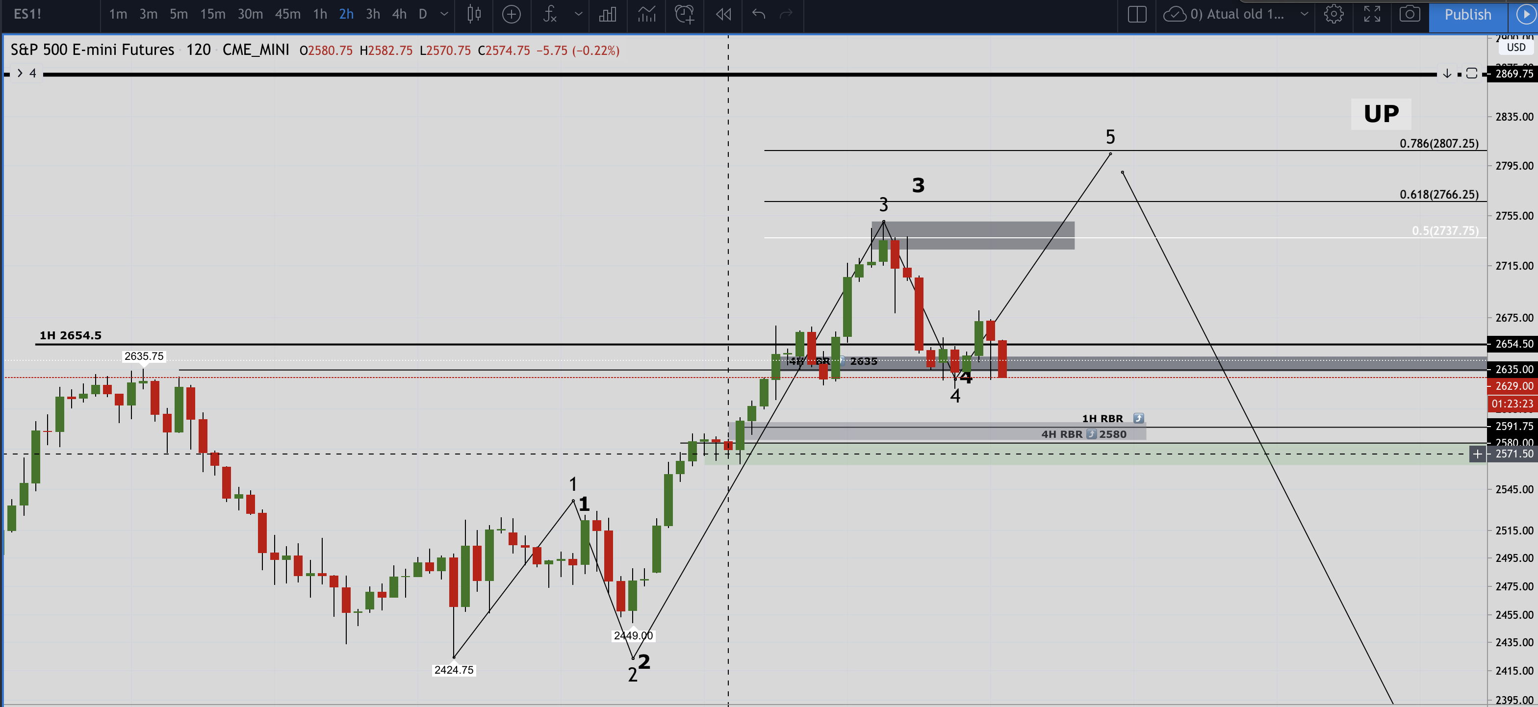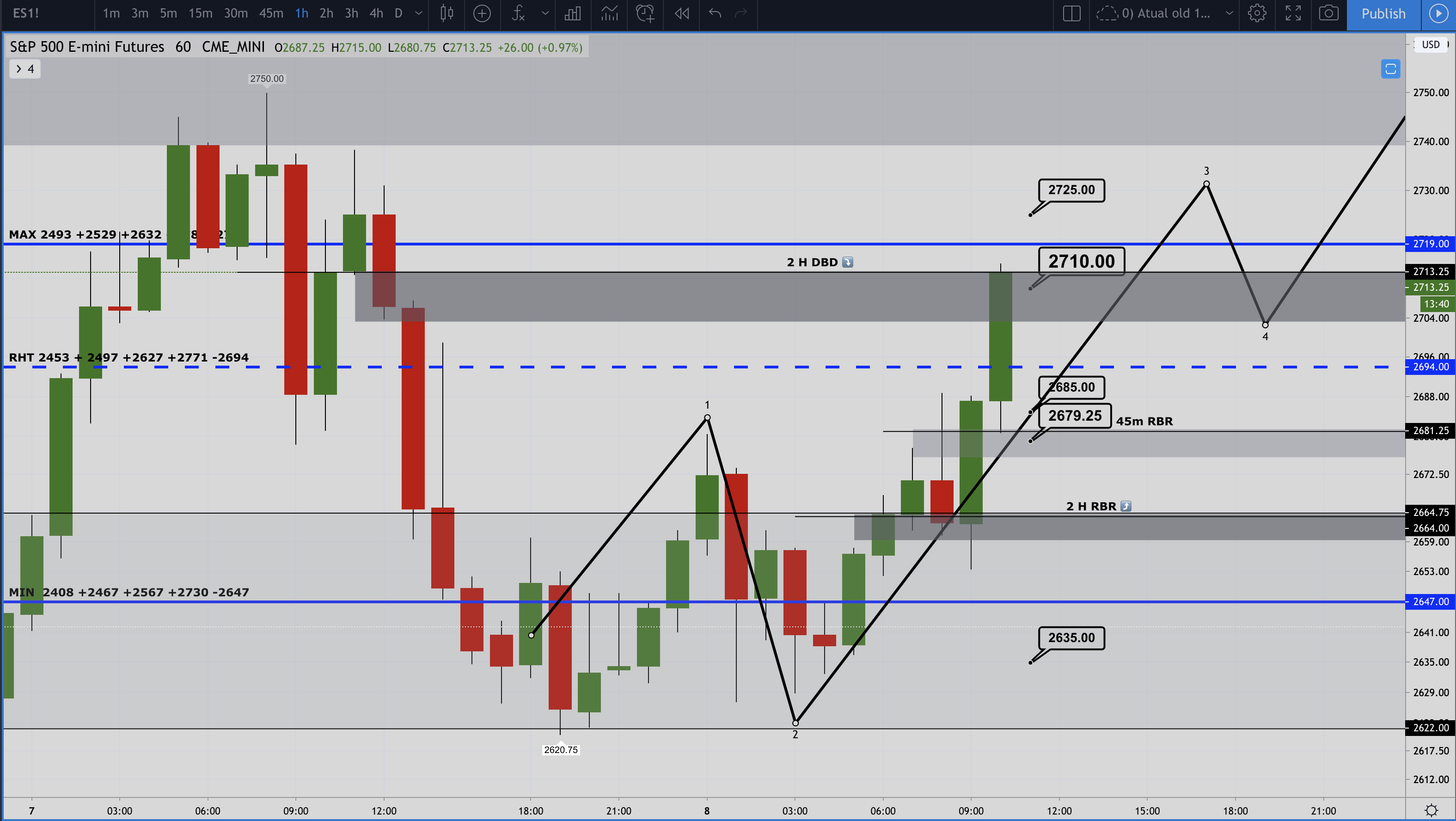Para os credit spreads preciso de determinar àreas de máximos e mínimos diários, para colocar posições nesses limiares. Por isso os gráficos refletem essa preocupação de identificar zonas e a sua sucessiva progressão. Essencialmente uso supply & demand do pessoal do forex, e umas pitadas de Elliott Waves.