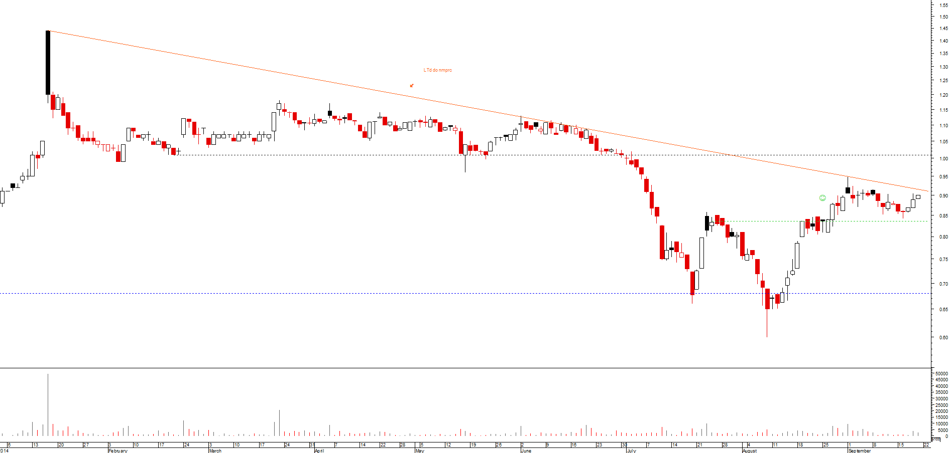Com base no velão de Janeiro a linha de tendência descendente apresenta vários toques. Após uma 1ª tentativa de break-out no dia 1 de Setembro, hoje tivemos nova tentativa. Com as 3 EMA's sobrepostas, embora os indicadores RSI e MACD não estejam inteiramente favoráveis, amanhã poderá ser um dia de decisões, ou continua a trajectória descendente, ou inverte e poderá ser o arranque para cima. Estou dentro com uma pequena posição.