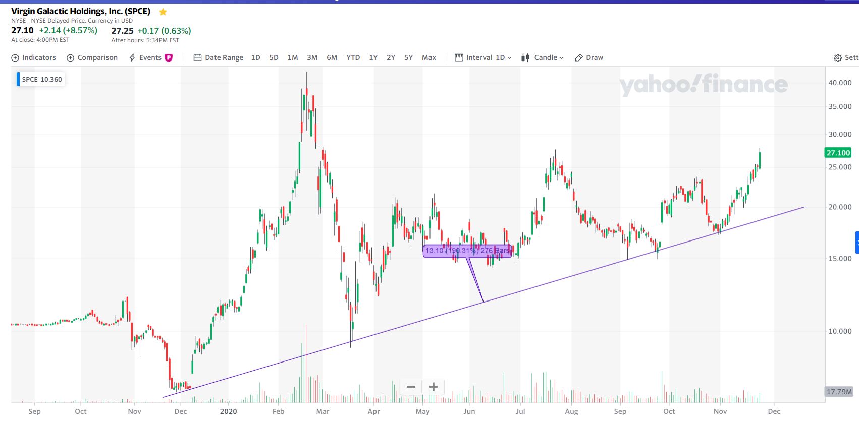 Bom comportamento da SPCE (Virgin Galactic), estou curioso para ver até onde consegue subir.