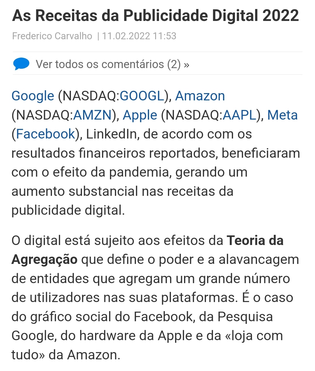 Só para relembrar os mais distraídos que a publicidade digital beneficia os grandes players mundiais e não os media: Google, Amazon, Apple, Meta e LinkedIn.