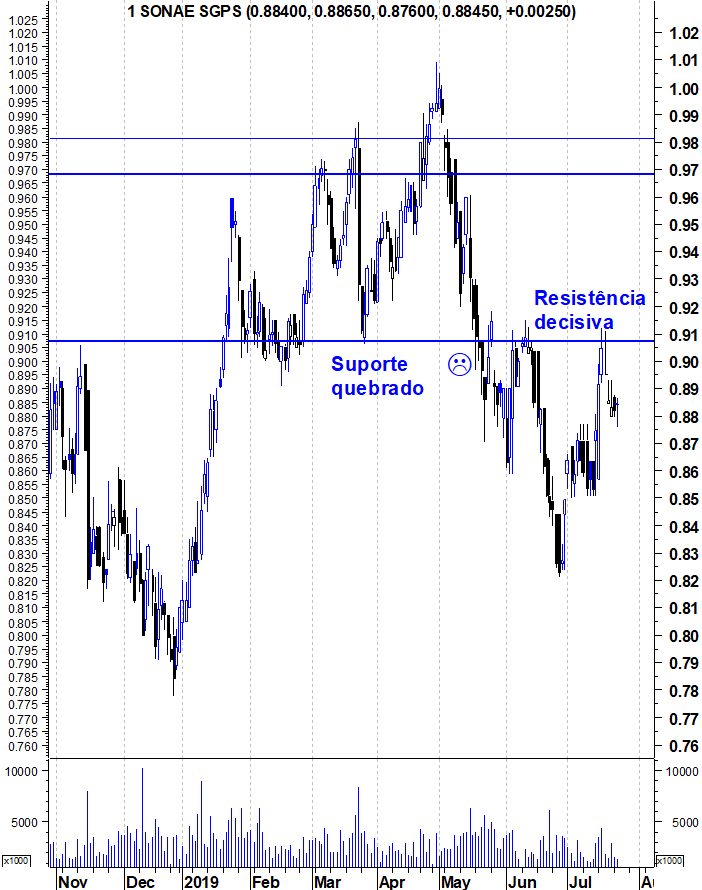 Deixo aqui o gráfico actualizado da Sonae SGPS. A resistência dos 0,91 euros continua a ser, na minha opinião, o ponto chave da acção.