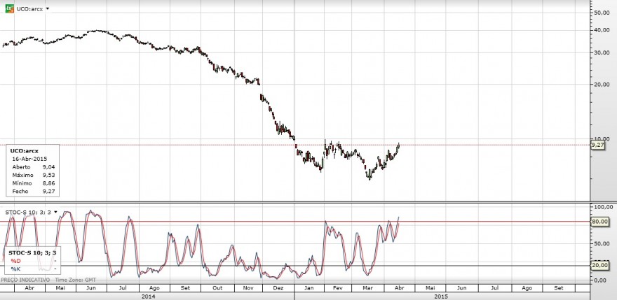 -> ETF's tipo USO, OIL, DBO, USL, BNO, etc. sofrem da questão do contango. Além disso são em dólares o que introduz um problema. Historicamente o dólar costuma desvalorizar quando o petróleo sobe. Ora se, tendo euros, investimos em petróleo em dólares, há uma probabilidade de quando o petróleo começar a subir, essa valorização, ser anulada pelo cambio euro/dólar. Ainda se podia tentar fazer a cobertura cambial mas além dos custos disso (visto que seria um investimento de longo prazo), o efeito contango manter-se-ia.