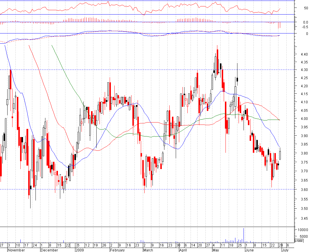 pois concordo plenamente com o realinvest, estarei atento ali na zona aos 3,60 novamente, com um stop logo abaixo desse valor de forma evitar perdas acentuadas. contudo acho o suporte demasiado solido para ser quebrado, mas nunca se sabe... em anexo segue o grafico..
