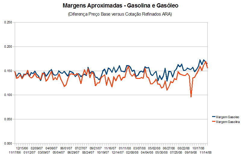 Sublinho, o gráfico mostra a diferença de preço entre o preço na bomba (antes de impostos) e o preço estabelecido para os refinados nos mercados internacionais. Trata-se portanto de uma estimativa muito aproximada da margem de lucro na distribuição e retalho dos combustíveis...