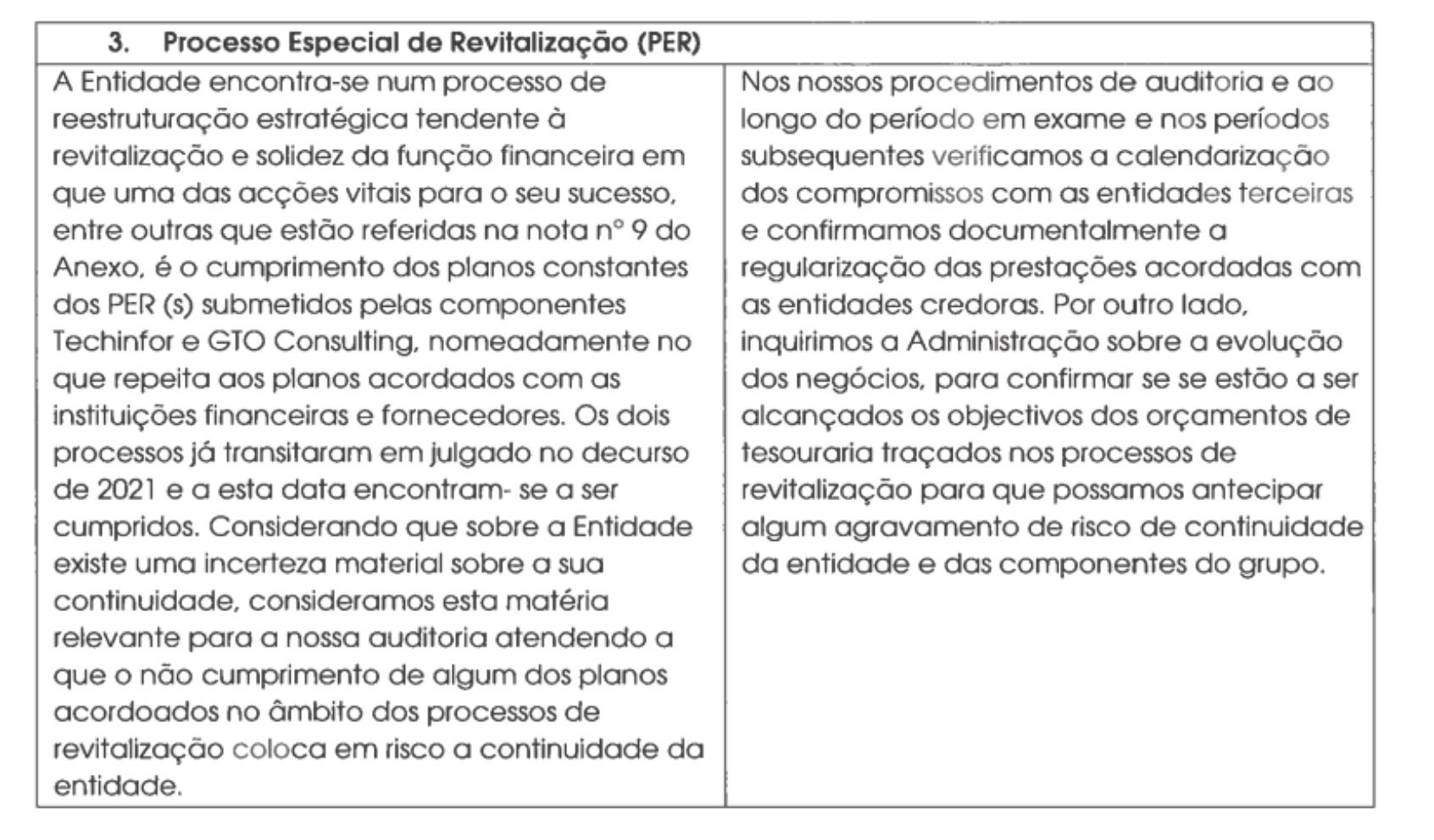 " Nos nossos procedimentos de auditoria e ao longo do período em exame e nos períodos subsequentes verificamos a calendarização dos compromissos com as entidades terceiras e confirmarmos documentalmente a regulazação das prestações acordadas com as entidades credoras (...)"