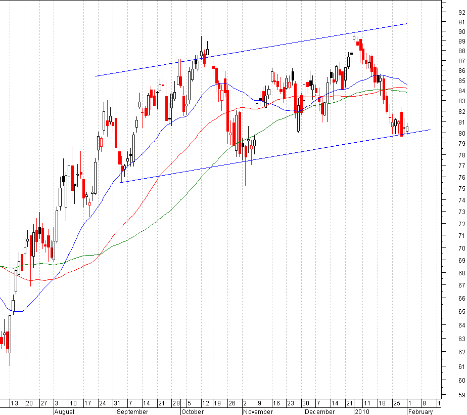 O teu gráfico dá uma visão mais "optimista" do título e, ao mesmo tempo, destaca o patamar actual (zona dos € 80,00 - € 81,00) como decisivo para a evolução da cotação no curto-prazo.