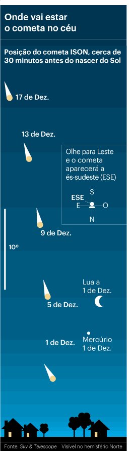 O cometa ISON já está visível a partir das 4 da manhã, antes do nascer do Sol. Lá para o fim do mês é capaz de vir a ser visível a olho nu em pleno dia. Depende do que lhe acontecer quando passar perto do Sol.