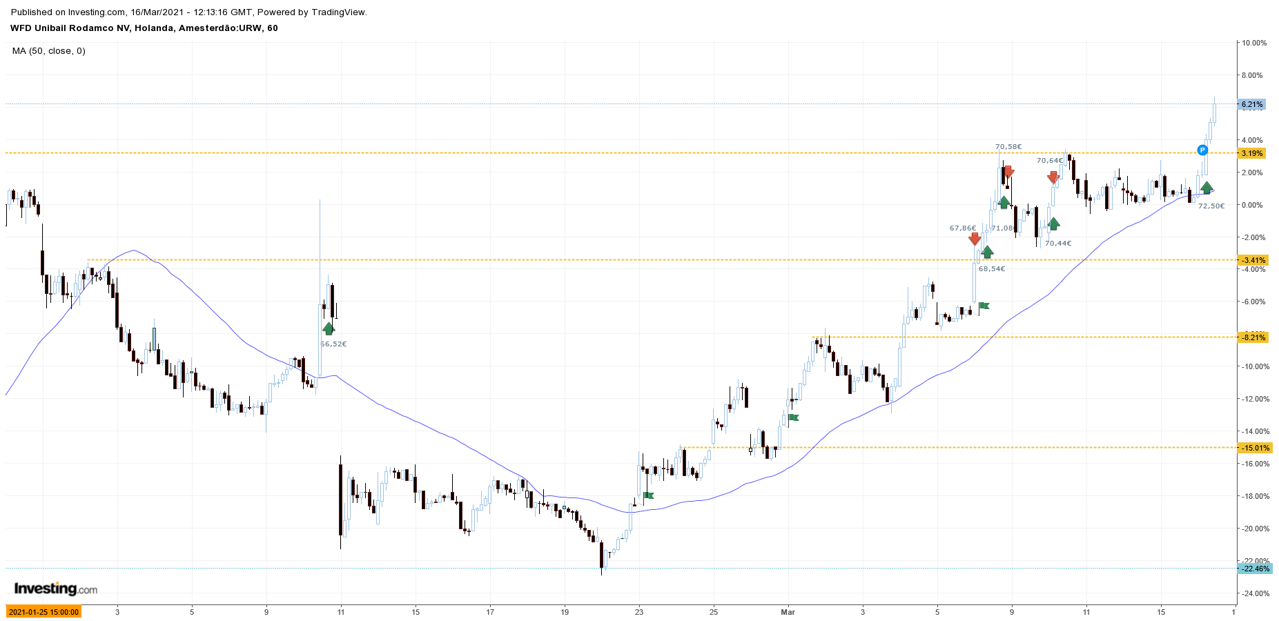 Eu agora não tenho nada na Unibail, coloquei tudo na Klepierre, mas se passar os 72€ com força, sou capaz de entrar na correcção.
