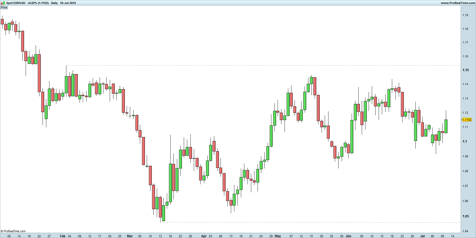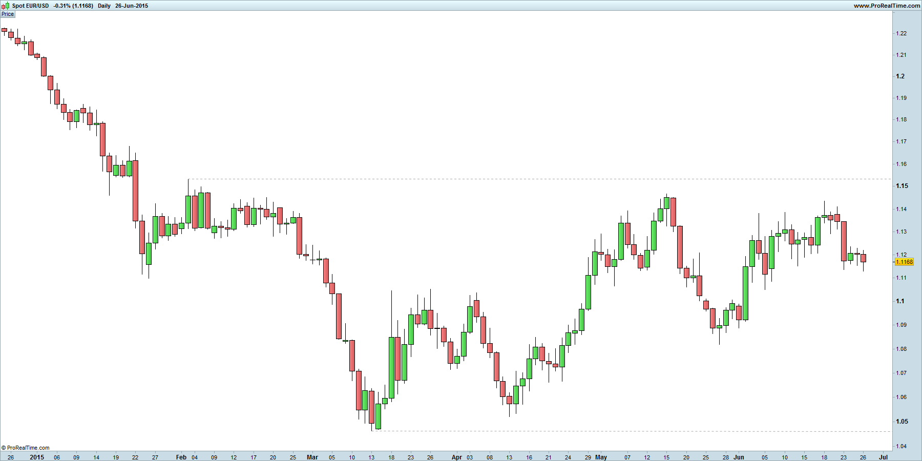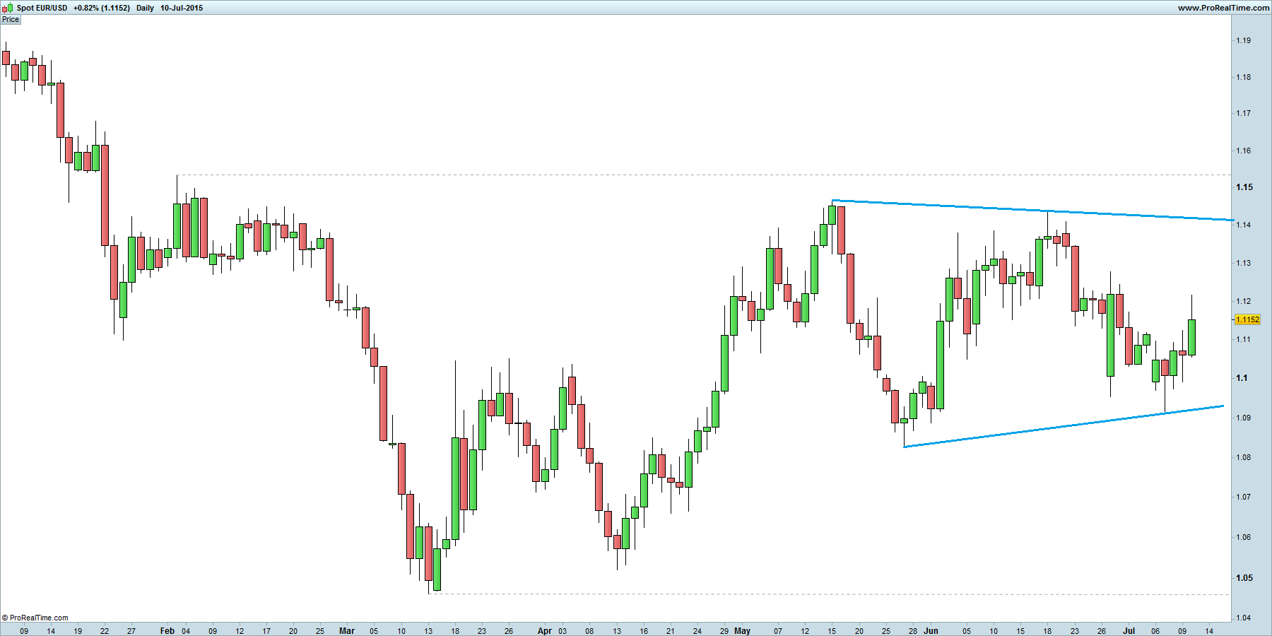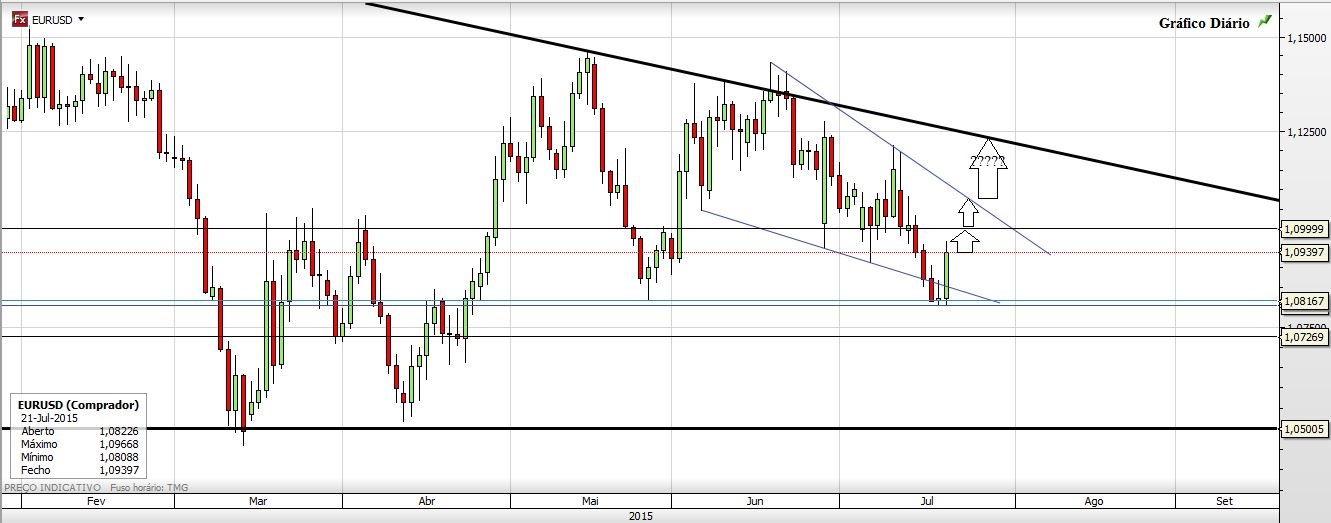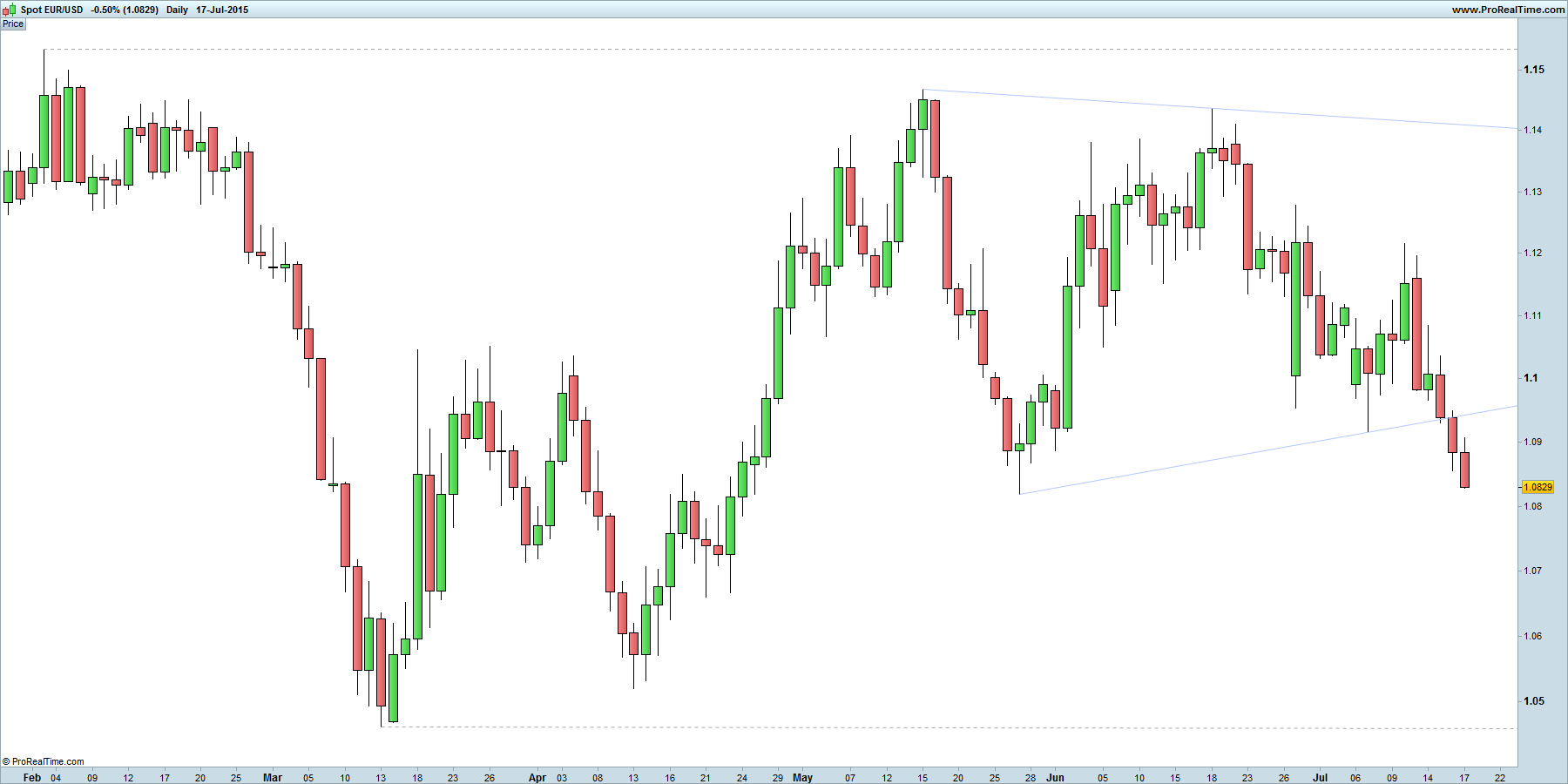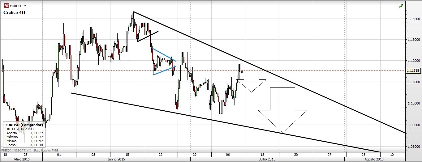 Curiosamente, quando a Grécia estava para sair do €, o par lateralizou por algumas semanas. Agora que parece ficar, o € aparenta vir por aí abaixo.