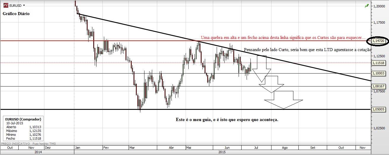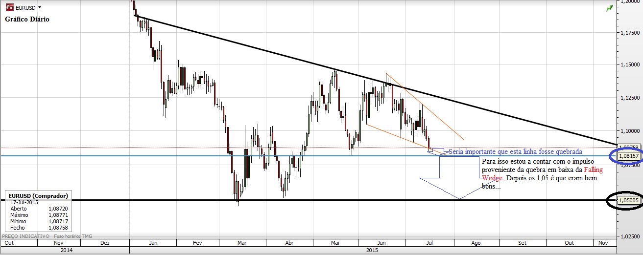 Acho que agora o EURUSD está num momento importante; chegou à base da Wedge, já lhe deu uns toques e estamos também muito perto do mínimo relativo de 27 de Maio. Amanhã é Sexta feira e a vela do semanal também está a ficar bonita (para os Curtos). Ou seja, acho que existe potencial para ir até à zona dos 1,05 para depois ir novamente até à LTD que tenho representada a preto. Esta tem sido a minha ideia.