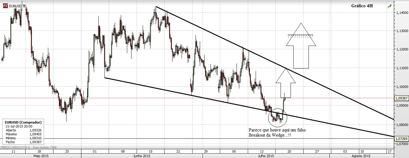 Esta vela de hoje veio-me estragar o esquema... pois bem, parece que estamos perante um falso breakout da wedge, assim, na reentrada do Preço na Wedge e depois de ter feito um máximo mais alto que o de ontem fui obrigado a fechar os Curtos. Se em vez de uma Wedge fosse antes um Triângulo Simétrico não teria tido qualquer duvida em meter os longos à bruta, mas como é uma Falling Wedge fiquei quieto até ao momento presente, já que não vivi até à data falsos breakout´s destas figuras, por isso estou por hora mais espectador.